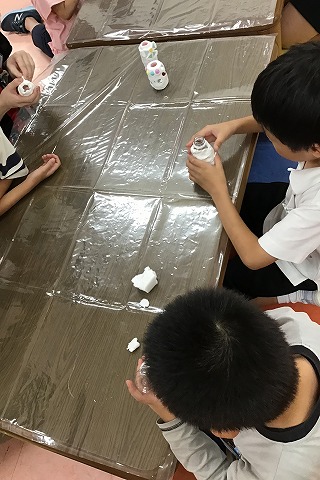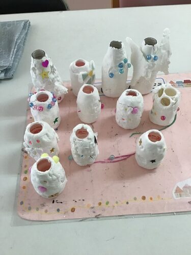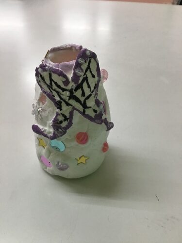 空き容器に紙粘土を付けて一輪挿しを作りました💐