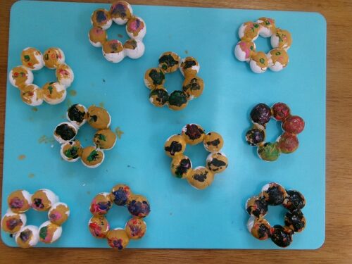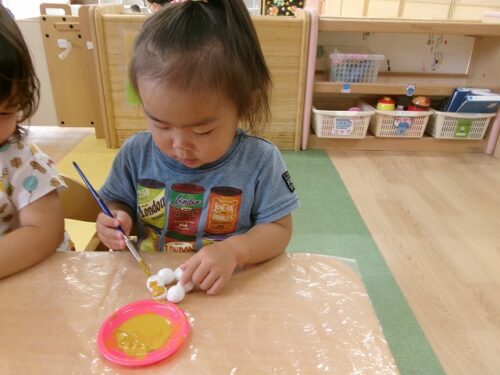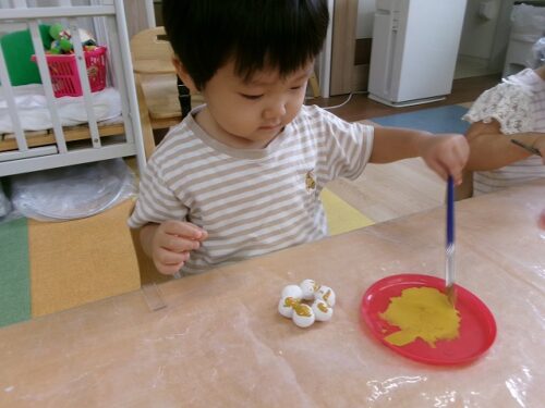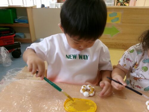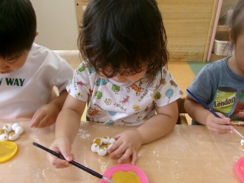 茶色い絵の具でこんがり焼き色を付けた後は、可愛くトッピング!