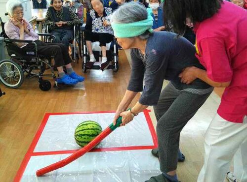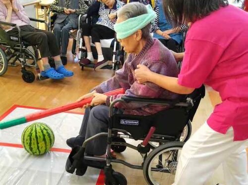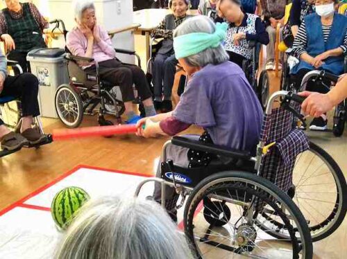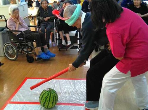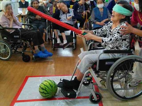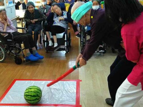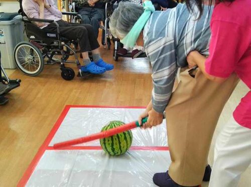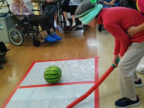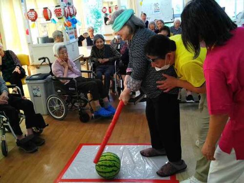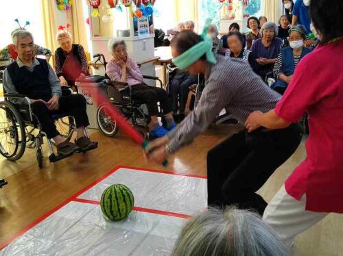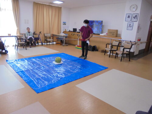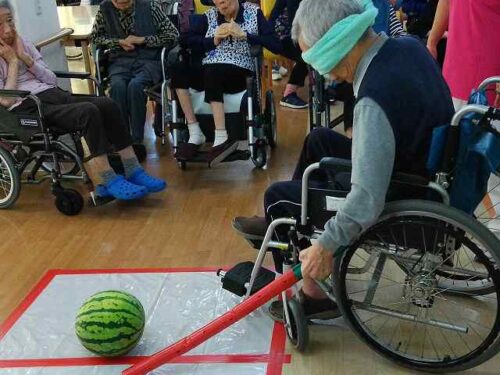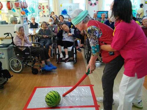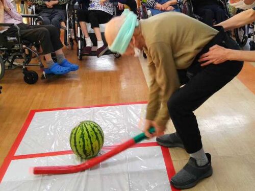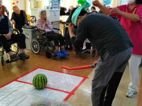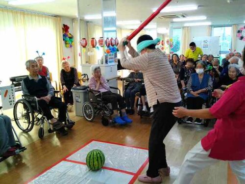 さわやか柏館 夏祭り~午前の部・スイカ割り~ (さわやか柏館 千葉県柏市介護付き有料老人ホーム) 2025-09-05 2025-09-05 柏館では8月30日に🏮夏祭り🏮を行いました。 午前と午後の二部制で、午前中はスイカ割り🍉とお祭りご飯を食べました! スイカ割りは1Fに集まって行いました! 沢山の方が参加して下さいました! 担当 松本
