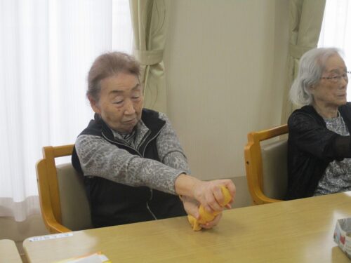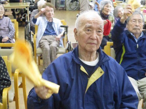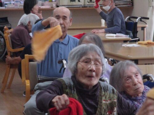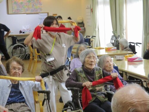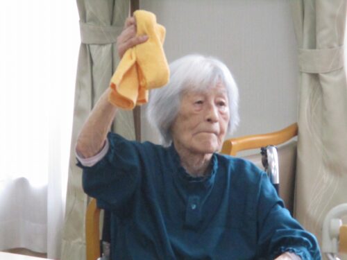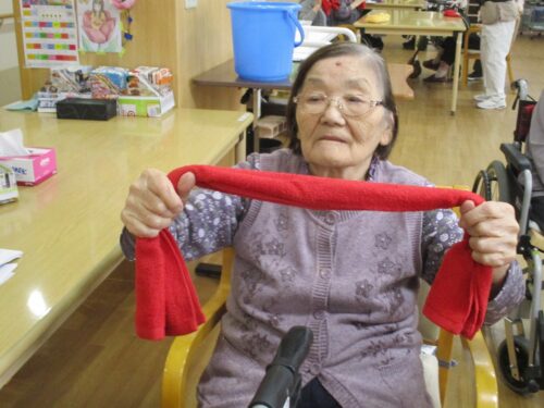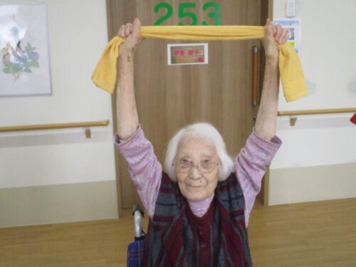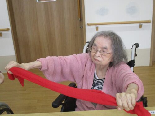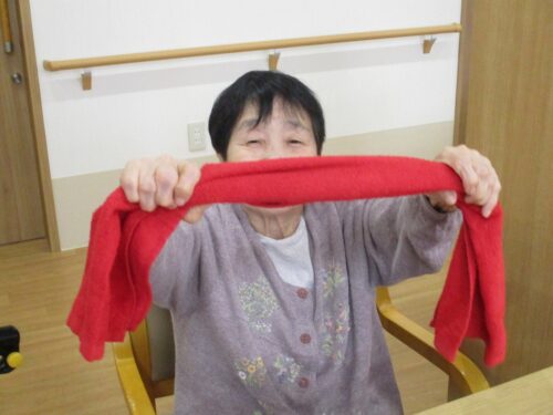 お次は、タオル体操です。タオルを2人で持って引っ張り