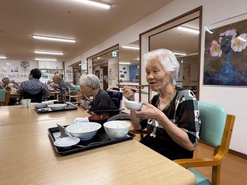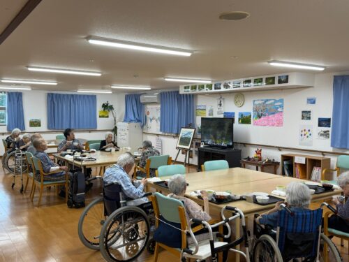 利用者様は美味しい食事を楽しみながら😋、テレビを見たり📺、お話をしたり💬、和やかなひとときを過ごされています🌸