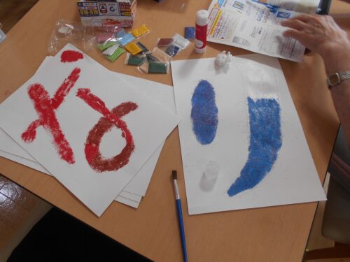 文字の部分に糊を塗って、カラーの砂を少しずつくっつけてくださってます。