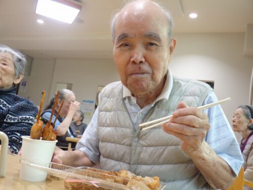 昼食は、焼きそばに唐揚げ、焼き鳥でした~。