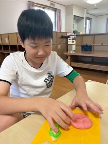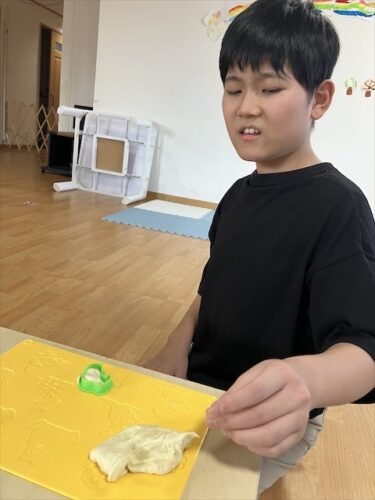 自分の手のひらでしっかり小麦粉粘土を掴み感触を味わう児童🧒