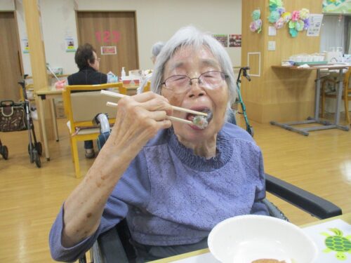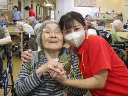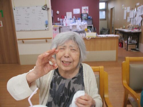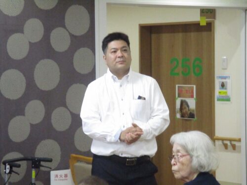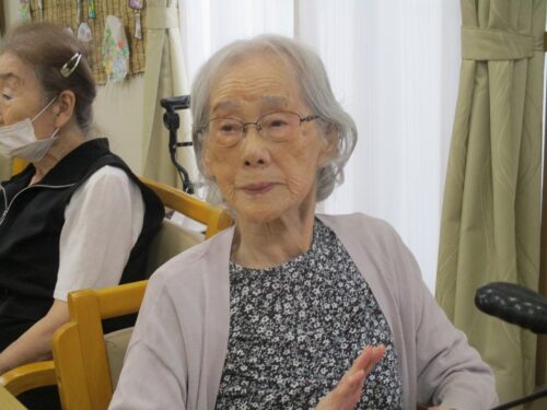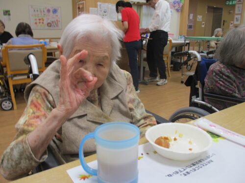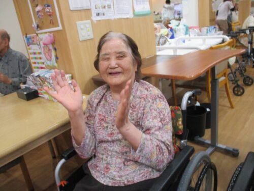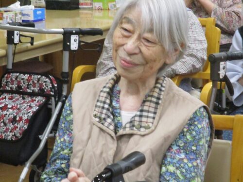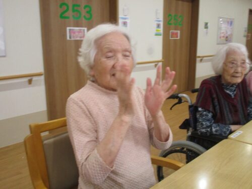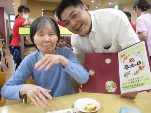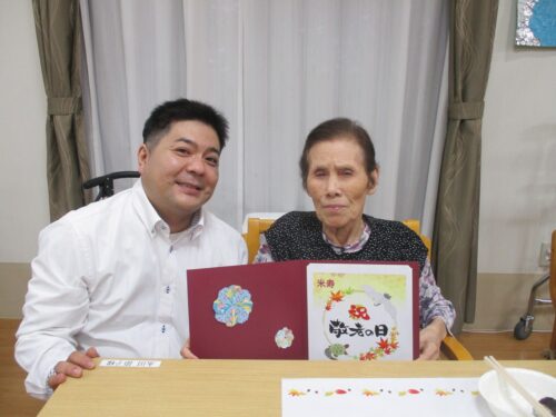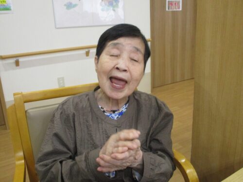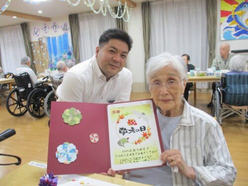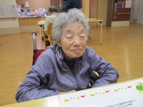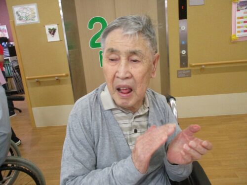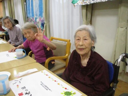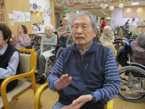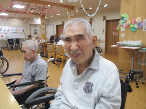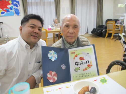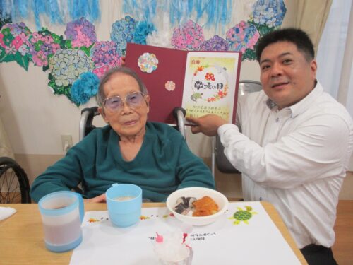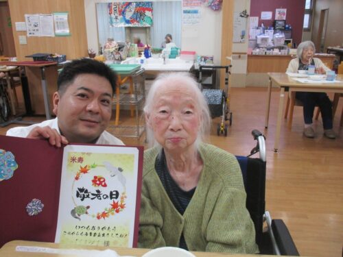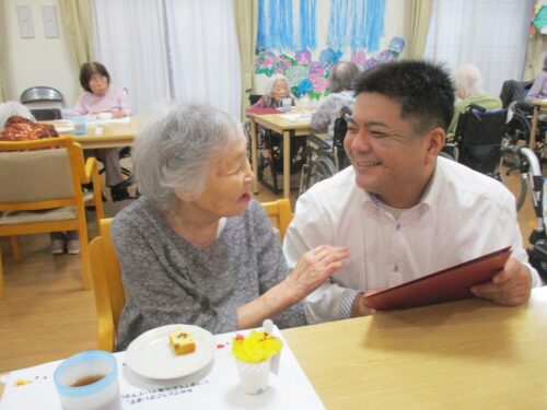 優しい入居者様卒寿おめでとうございます。といわれ大きな声で
