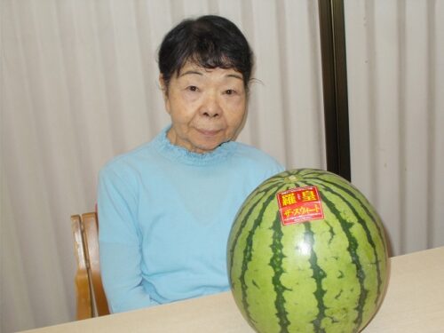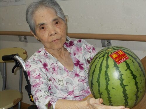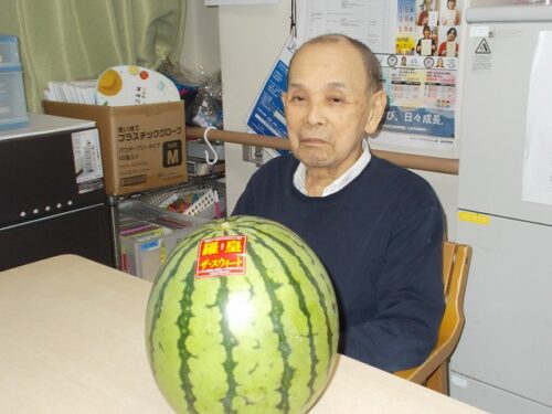 西京極では14日に敬老の日のお祝いをさせて頂く予定ですが、おやつの時間にはスイカ割りも予定しています。今日は先に届いたスイカと一緒に2Fの入居者様には記念写真を撮らせて頂きました。9月の中旬とは言え、まだまだ暑い日が続いており、冷たいスイカを美味しく召し上がって頂けそうです。
