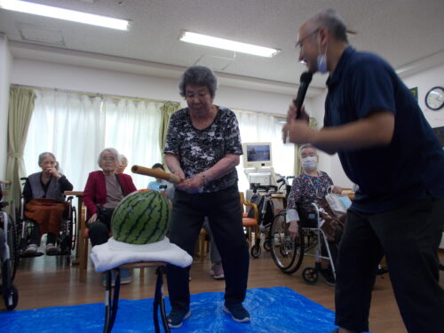 さわやかはーとらいふ西京極 スイカ割り祭りpart2 2025-09-18 2025-09-14 スイカ割り祭りが開催されました。叩く棒がヒットしたときは「おおーっ」と歓声がわいていました。最後にみんなで頬張って食べておられ、中には漫画のように激しく召し上がっておられました。すごくおいしかったのだと思います(#^.^#)