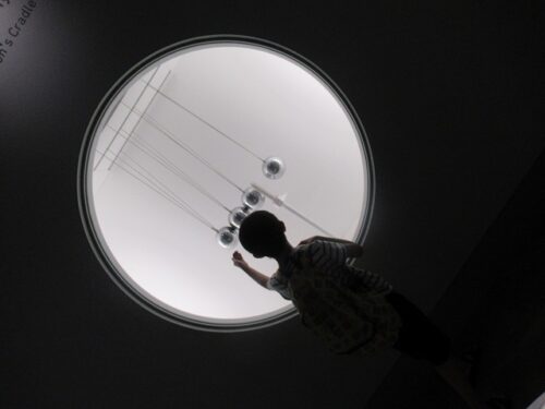端の球をぶつけると、反対側の球も同じ分だけ動き出します🫡