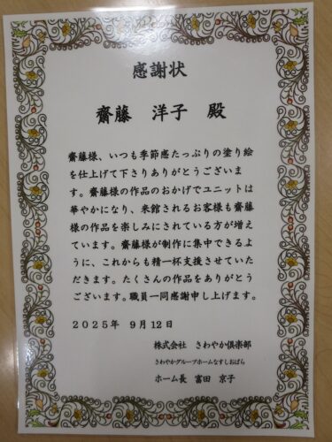 さわやかグループホーム なすしおばら すいせんユニットの様子 『感謝状贈呈』 2025-09-17 2025-09-16 毎月、施設よりご利用者様へ『感謝状』を送らせて頂いてます。 いつもありがとうございます(*^_^*) これからもどうぞよろしくお願いします。