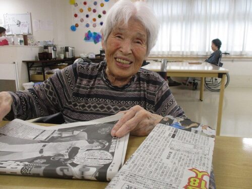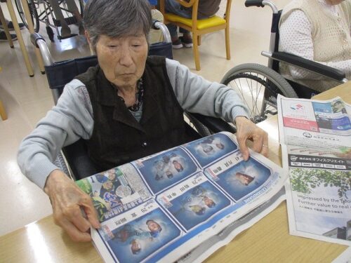 フロアで使用する新聞紙を使いやすいように折るお手伝いをして下さったりされていました。手の運動にもなりましたね👍