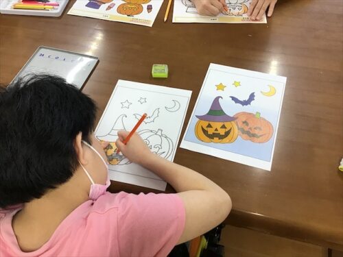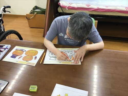 廊下に飾ってある利用者様の作品を、秋仕様にしよう!ということで、レクの時間を使って秋のぬり絵や貼り絵を楽しみました❣️
