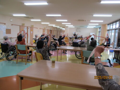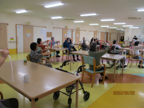 2階フロアで機能訓練指導員の畠さんに合わせて体操されています。