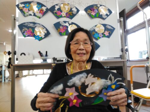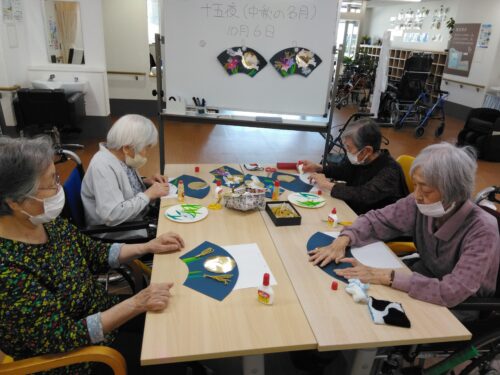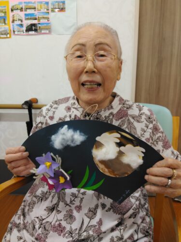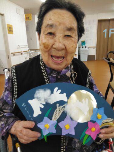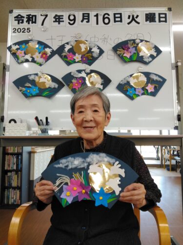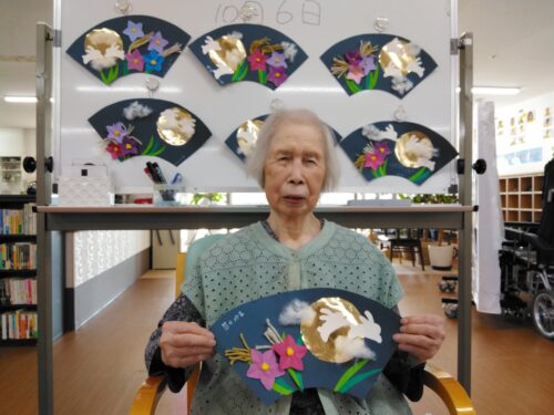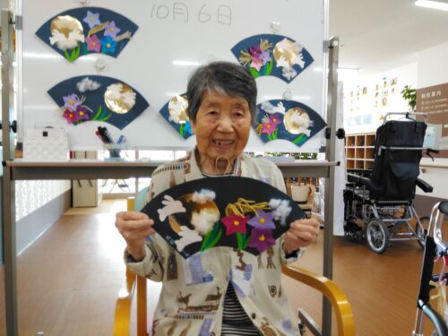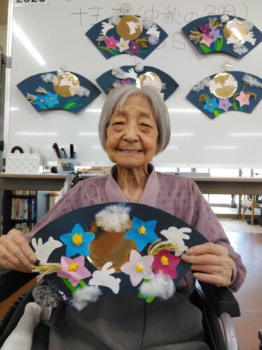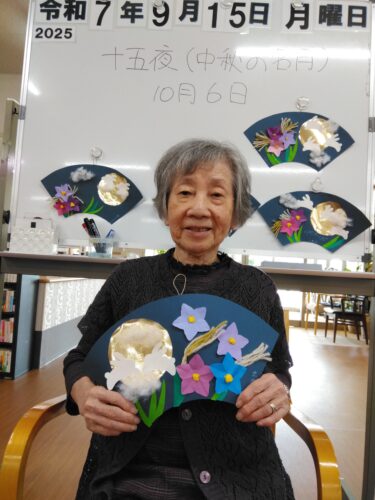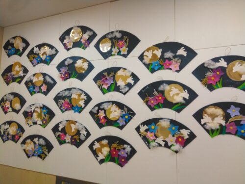 お月様・桔梗の花・すすきを扇に飾り付けました。