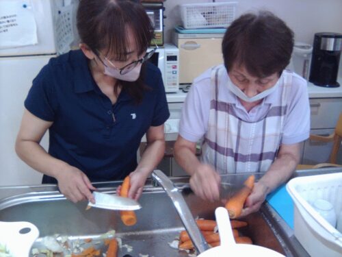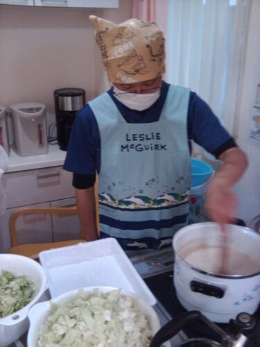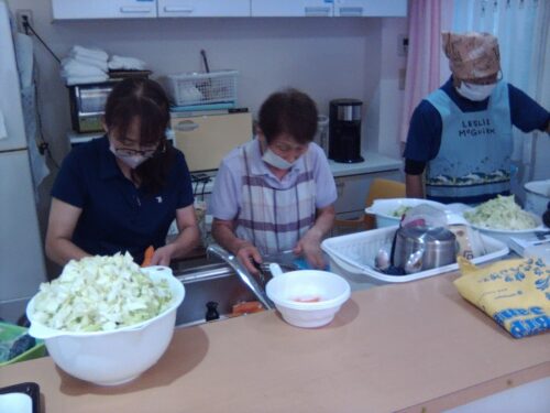 栄養士さんが指揮を執り、焼きそば用の野菜を準備しています🥬