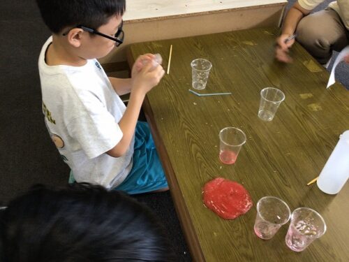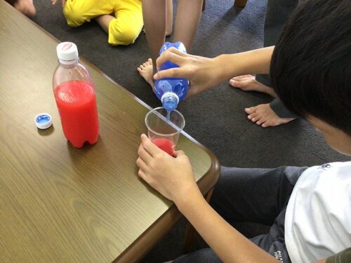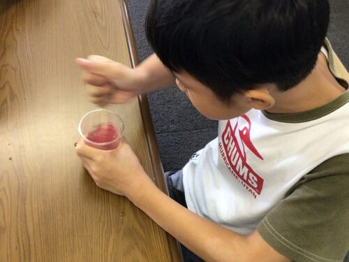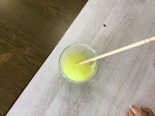 色水のカップにホウ砂水を入れたら、手早くかき混ぜます!