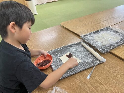 月見パイの中にはあんこ、バター、おもちを入れていきます❗