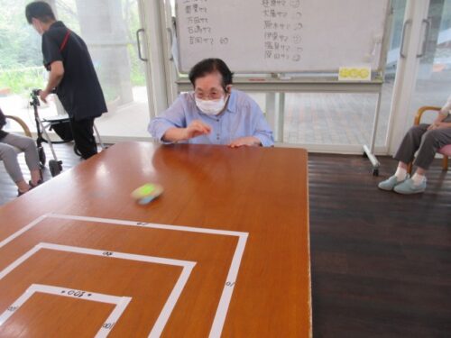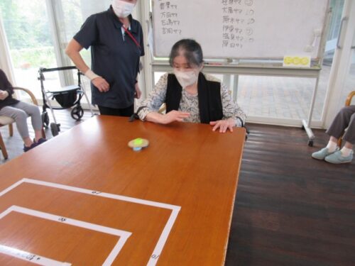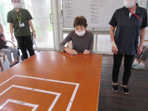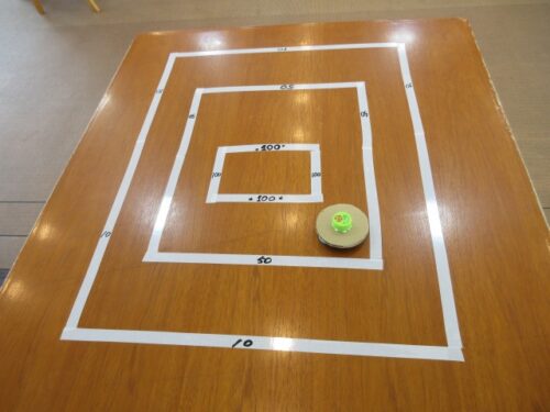 テーブルに枠取りをし、その枠内を狙ってストーン❓を滑らせます➰🥌