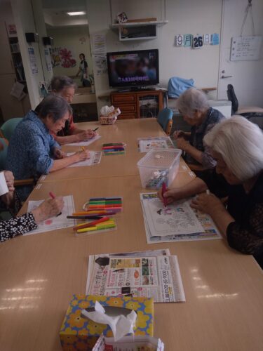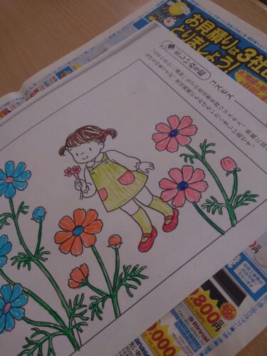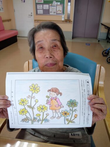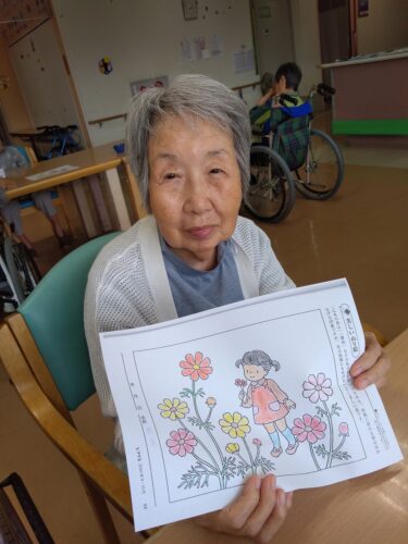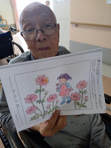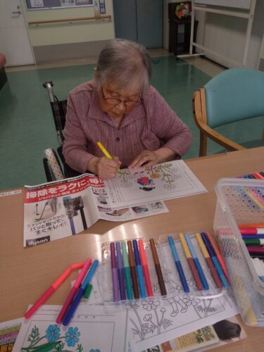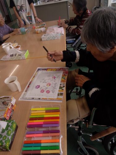 午後からは、各フロアでコスモスの色塗りを行いました!