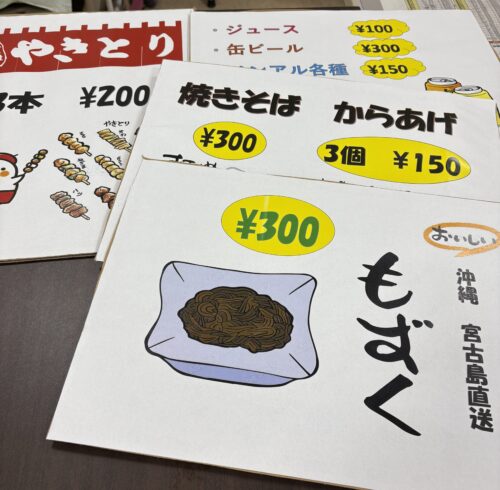 焼きそば・焼き鳥・から揚げ・フランクフルト・稲荷寿司・ソーダーフロート