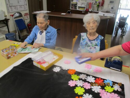 紅葉や、月見、ウサギやコスモスを介護員が作ったものを