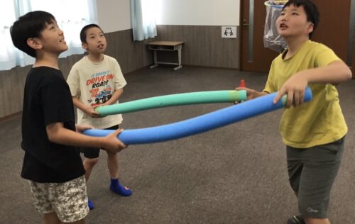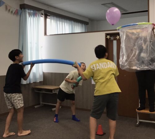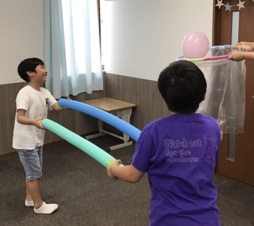 2人で一本のプールスティックを持ち、その風船を落とさないよう、ゆっくりとゴールへ向かいます。風船が軽いため、少しの揺れや、どちらかの動きが速すぎたり遅すぎたりするだけで、すぐに落ちてしまいます