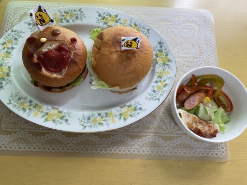 ハンバーガーの上のフラッグは6年生のMさんが作ってくれました。弐番館のキャラクター「にっこりさん」です^^ パプリカやトマトは、子ども達と一緒に育てたものです。子どもたちは「おいしい!!」と言って食べていました。コンポストの土で育てたので味も濃いはず!