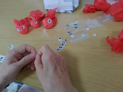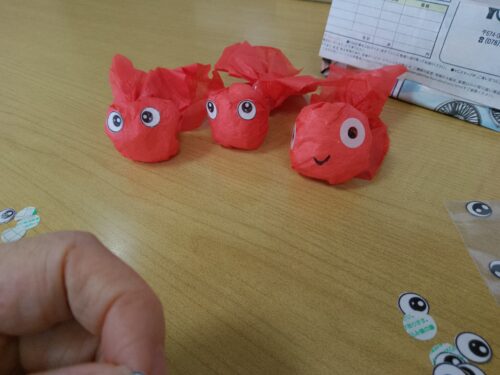 今度お祭りで使う金魚の制作を、御入居者様と一緒にしました(`・ω・´)