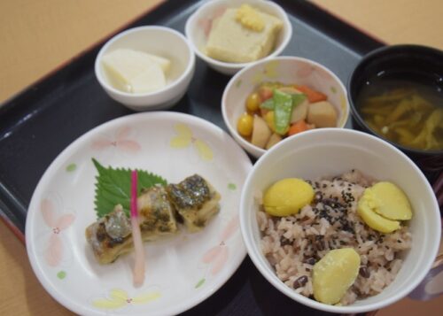 太刀魚の山椒味噌掛け、栗入り赤飯、胡麻豆腐、きのこ汁、デザートには梨が提供以されました!