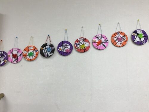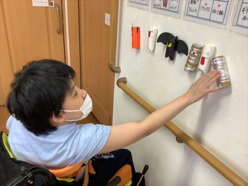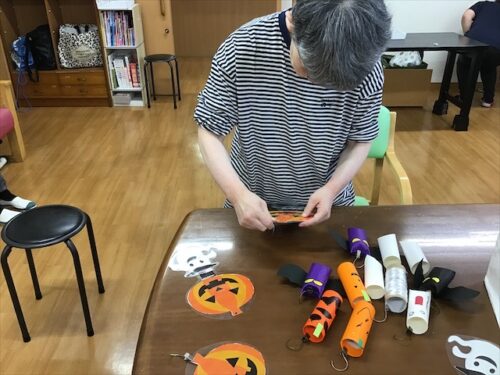 利用者様にも手伝っていただき、おばけやかぼちゃ、コウモリにミイラ…個性豊かなハロウィンの仲間たちを天井から吊るしたり、