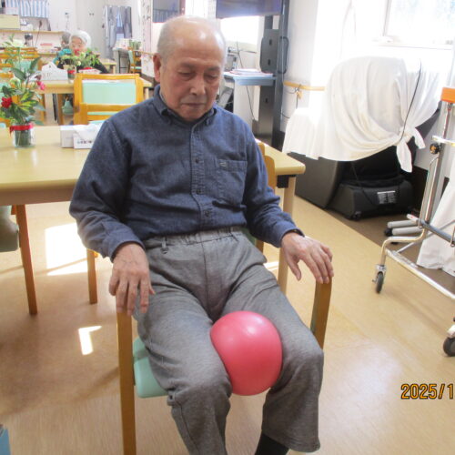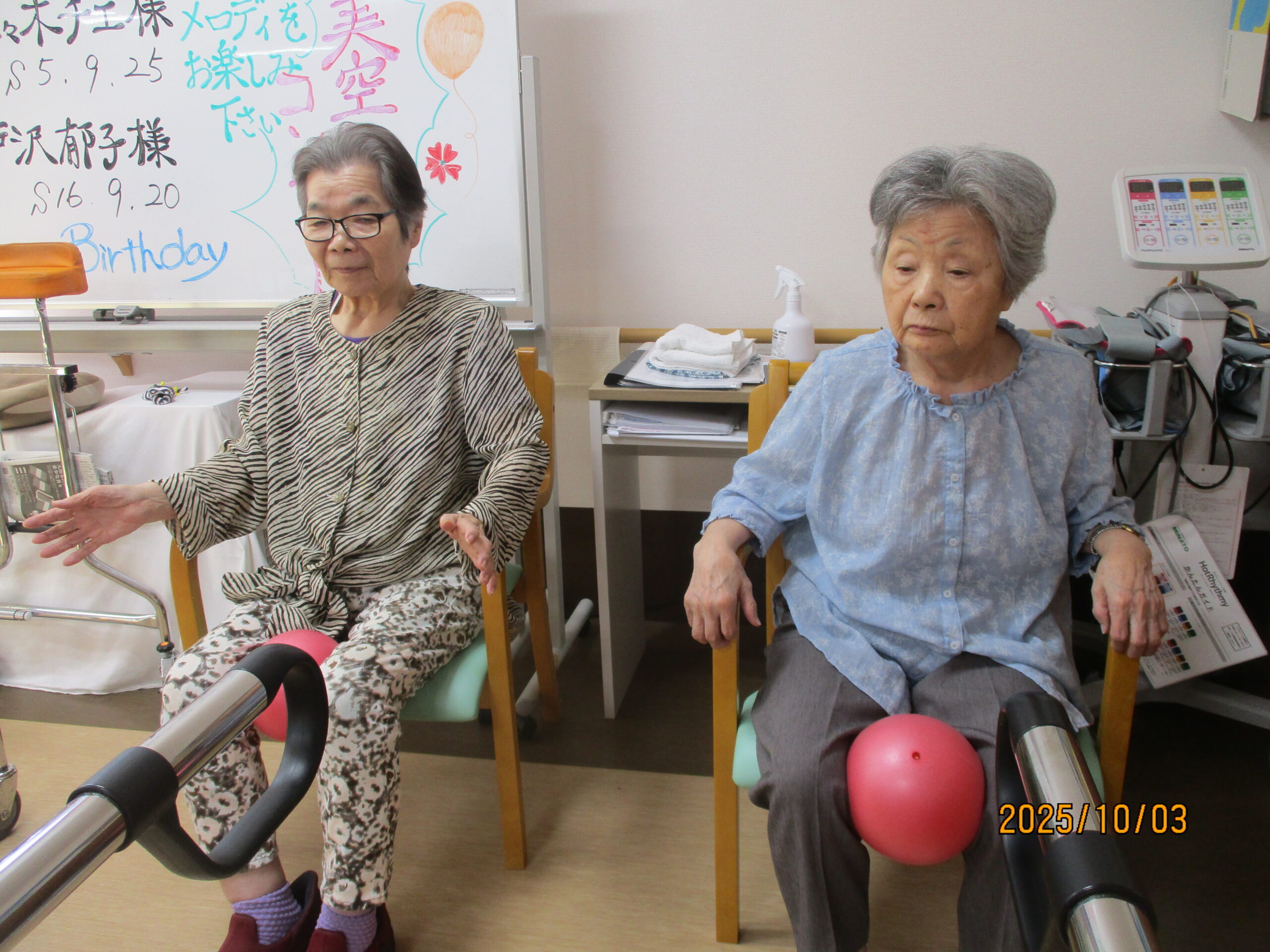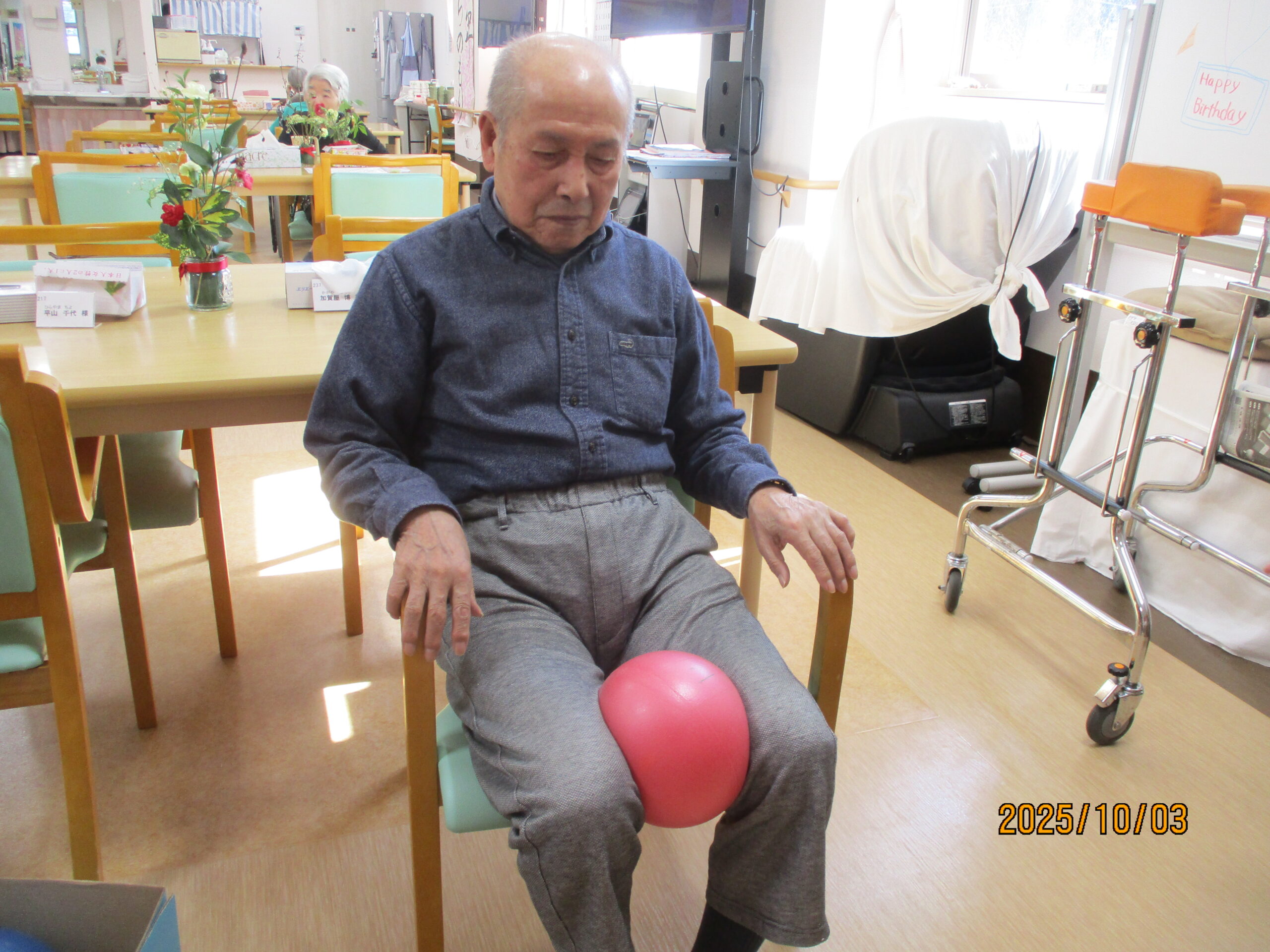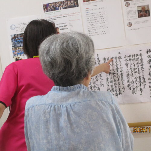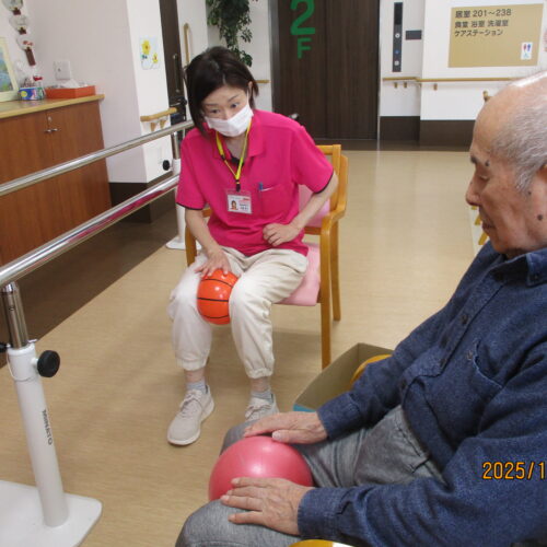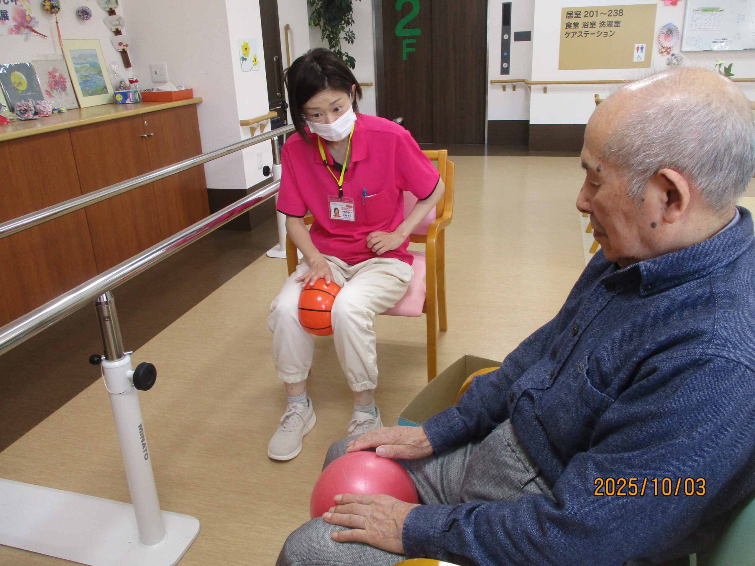リハビリでは、ボールを使って足を上げたり、2階館内散歩してその後秋田県民歌を一緒に歌いました。