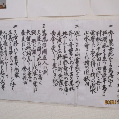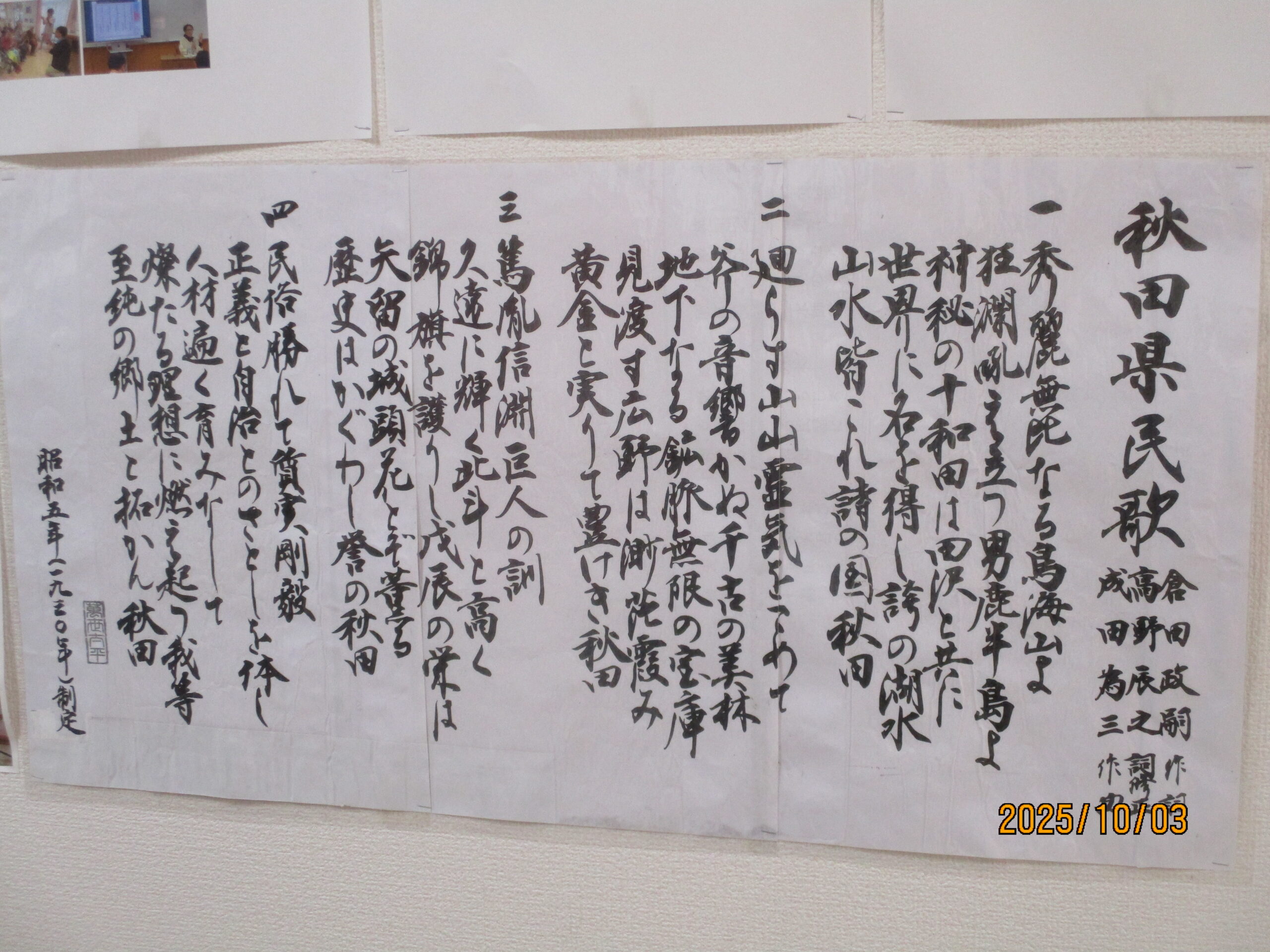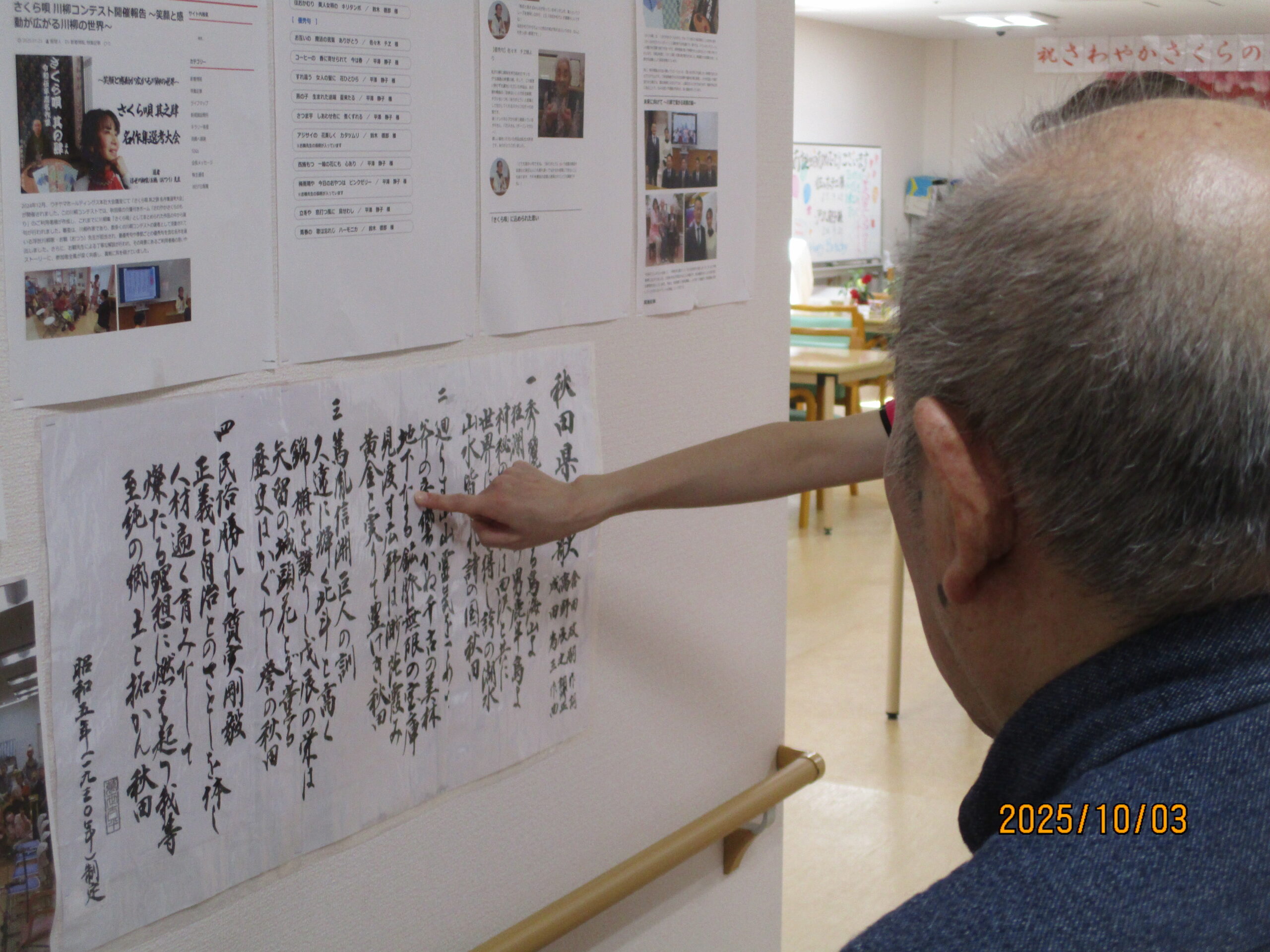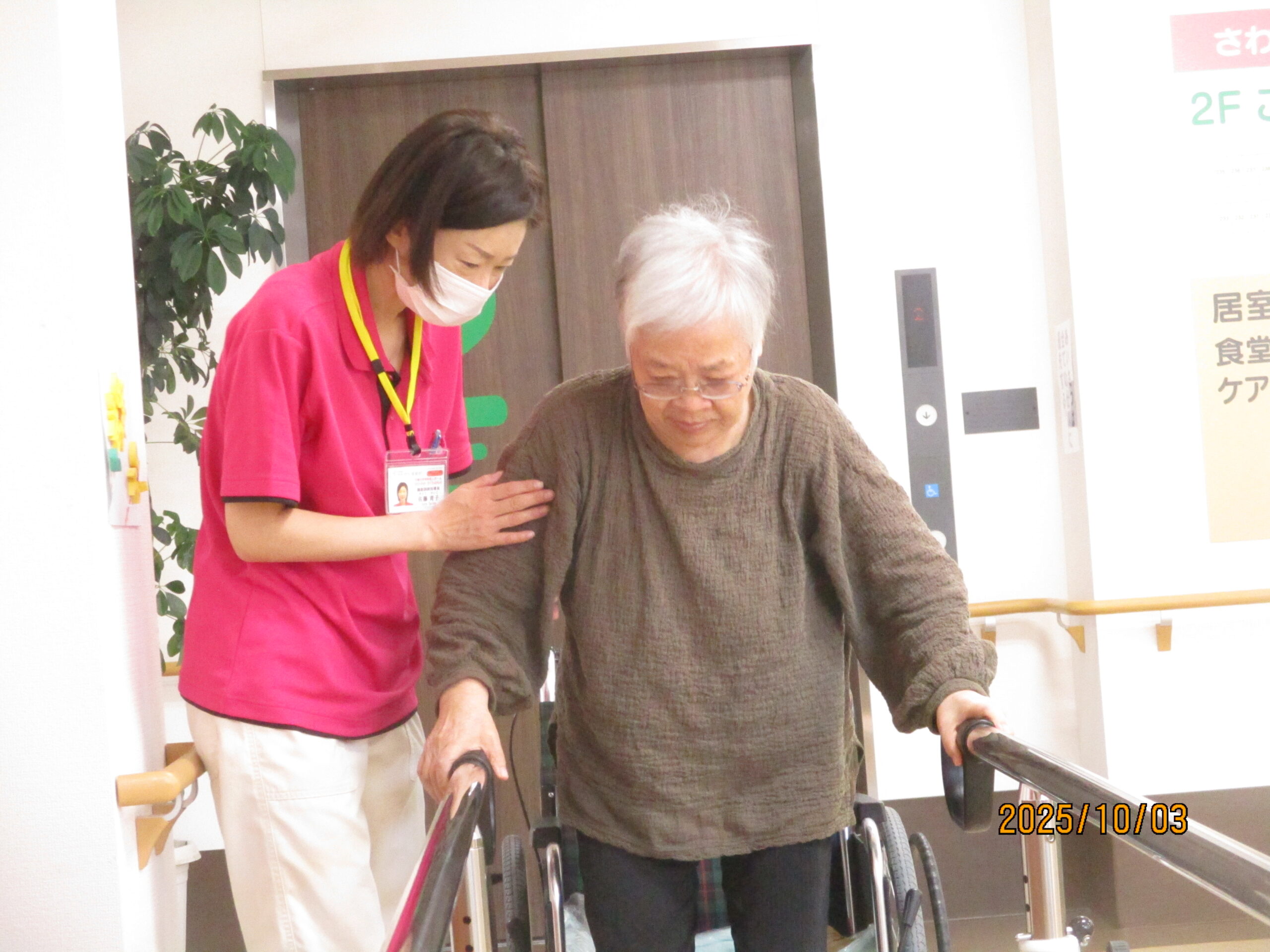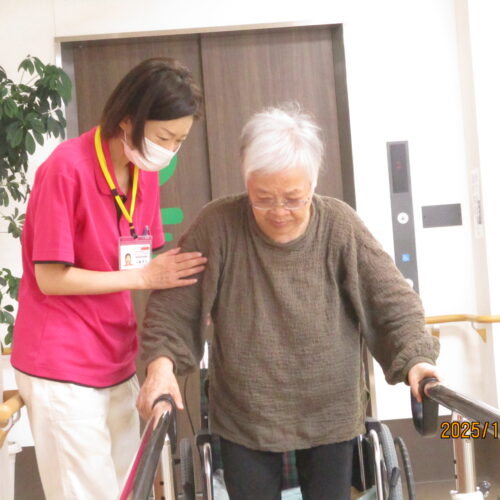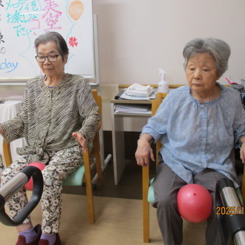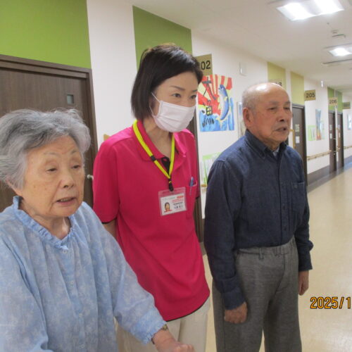 リハビリでは、ボールを使って足を上げたり、2階館内散歩してその後秋田県民歌を一緒に歌いました。