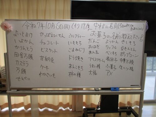 さわやか室蘭弐番館 3階 6日活力朝礼♪ 2025-10-07 2025-10-06 皆様こんにちは♪ 昨日の様子をお届けします 9時からラジオ体操です 頭の体操はお菓子の種類お答え頂きました🍰 10月6日は中秋の名月ですが 朝から空は雲に覆われている室蘭です 雲がはれて綺麗なお月様が見えます様に