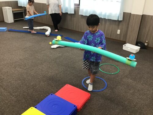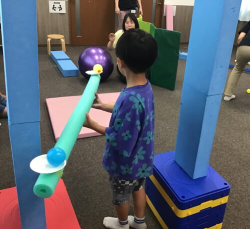 今日のミッションは、プールスティックの両端に乗せた紙皿の上のボールを落とさずに、4つの難関障害物をクリアすること。みんな、緊張とワクワクが入り混じった真剣な表情でスタートラインに立ちました