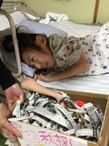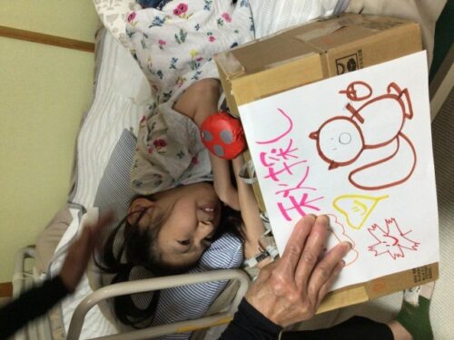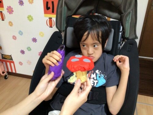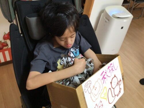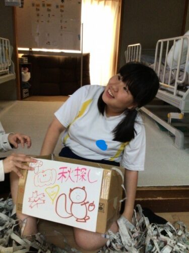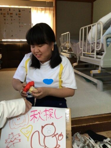 段ボールの中に新聞紙と画用紙で作った秋の食べ物をいれて