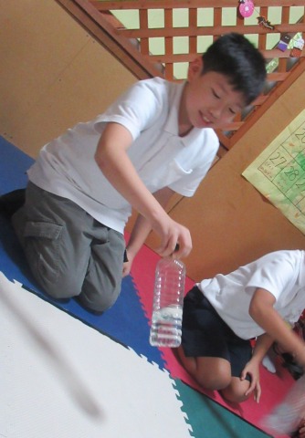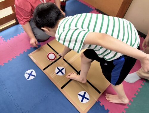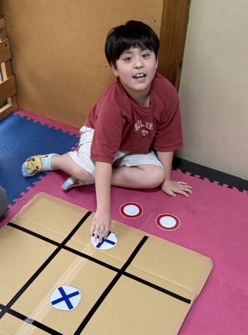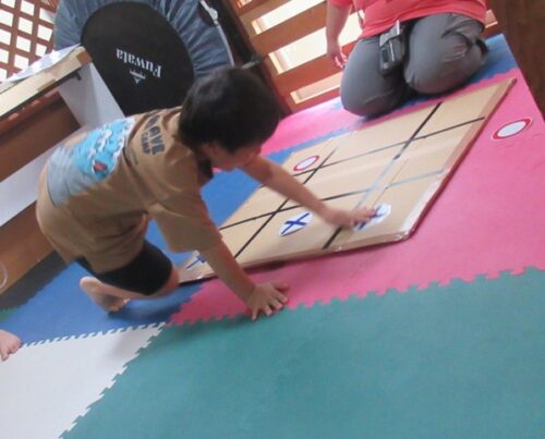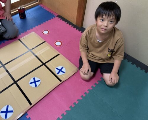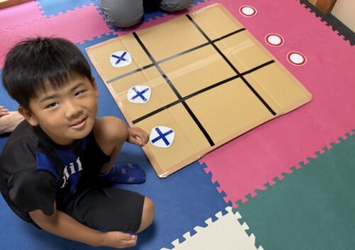 〇✕ゲームとペットボトルフリップの二つの活動が合体した遊びでしたが、