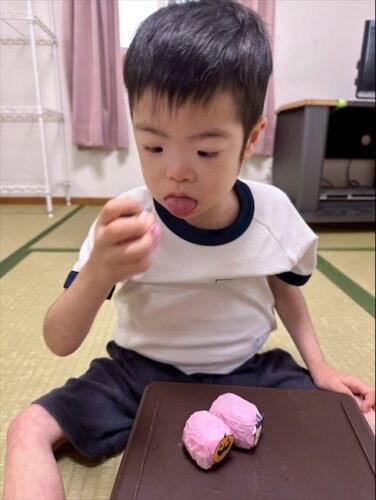 手作りツムツムの感触を楽しんだり、職員と一緒に積み上げて楽しみました😊✨