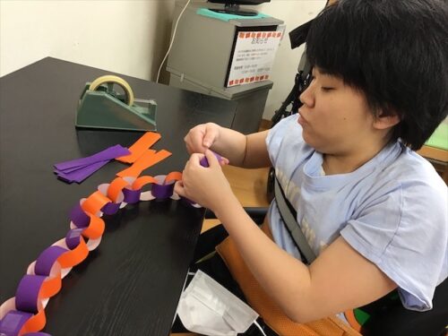 ハロウィンカラーの輪つなぎ作りを2人で協力して作っていますよ