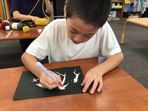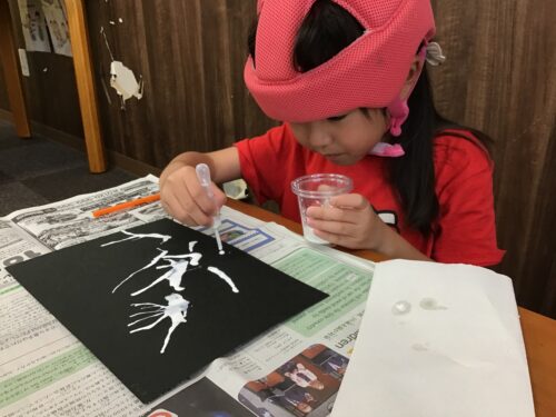 絵の具が 乾いたら、偶然できたかたちに、目や口を描きおばけに変身させます。