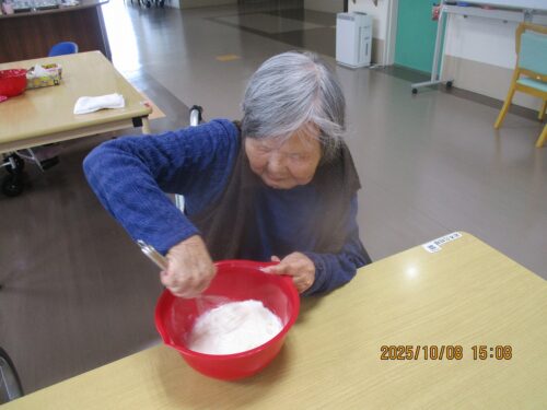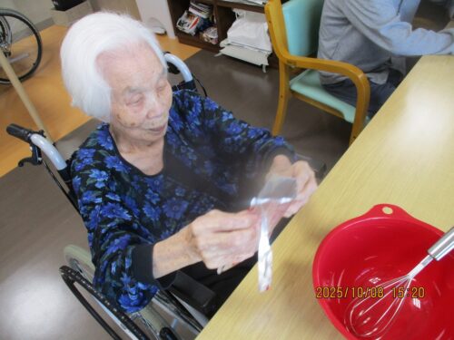 説明書に1秒に2回のスピードと書いており、それを見た方が勢いよく混ぜておられ、それを見ていた他のご入居者様が笑いながらも真似をしておられました。