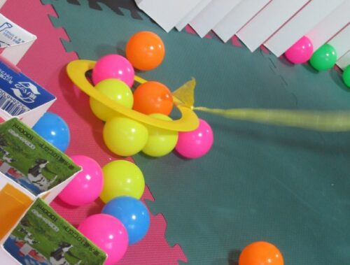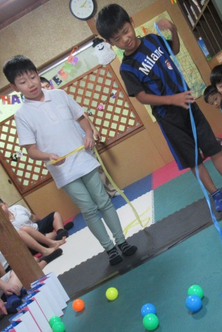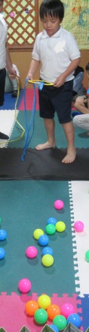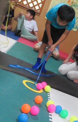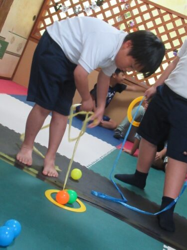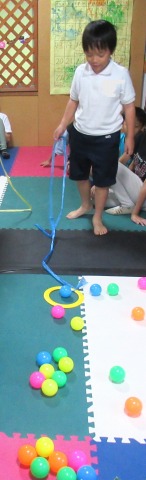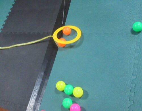 紐の付いたフープをたくさんお手玉がある場所に向かって投げます。