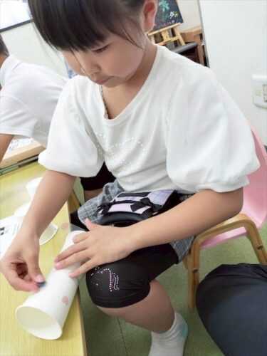 ゴムが3本まっすぐになるよう、中の紙コップの切り込みを上下で合わせながら掛けます