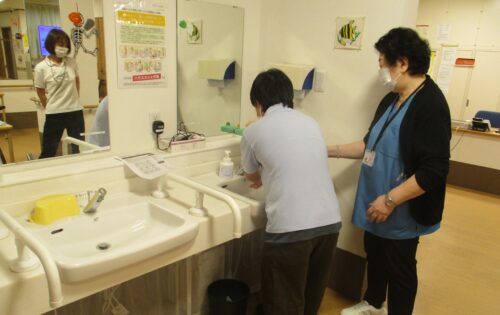 今日は職員が集まって、感染症対策の勉強会を開いています。