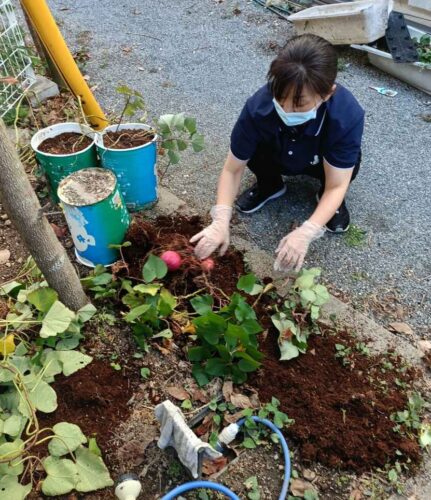 来年は入居者様分のみならず、職員さんの分まで収穫すると意気込んで、今回の足りない分はスーパーへ買い出しに…(笑)