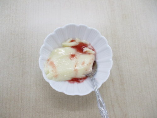 豆乳プリンにはいちごソースが掛かっており好評でした🍓