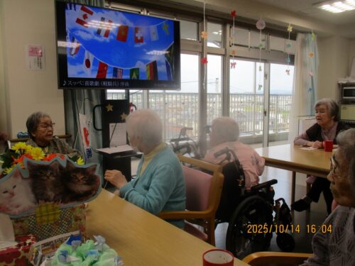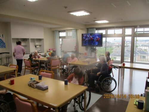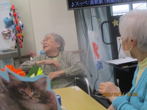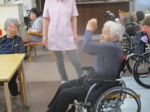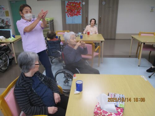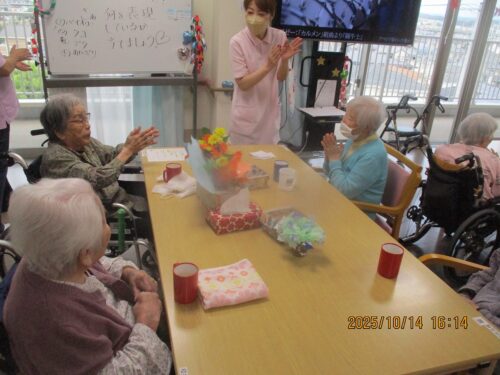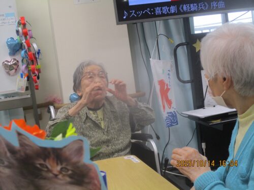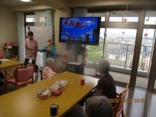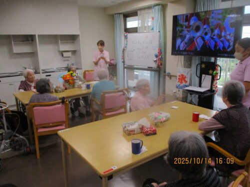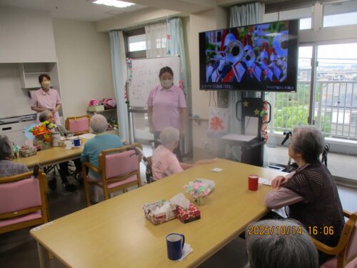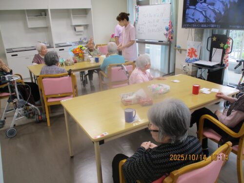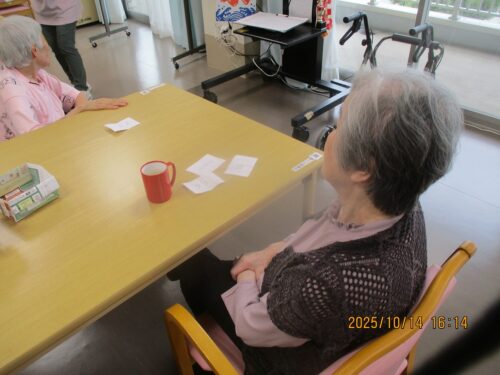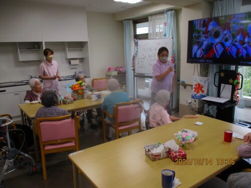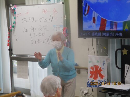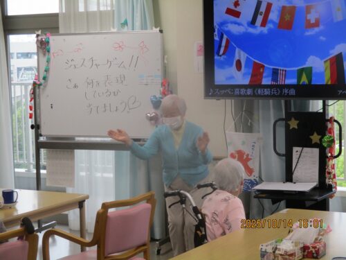 ご入居者様に紙に書いた物の動きをして他のご入居者様に答えていただきました。