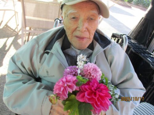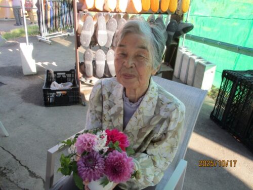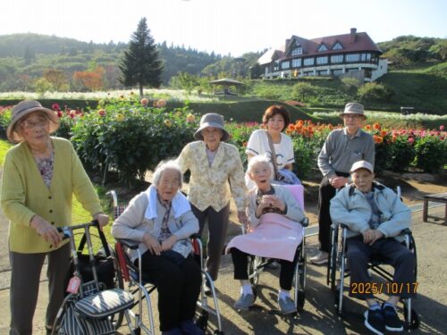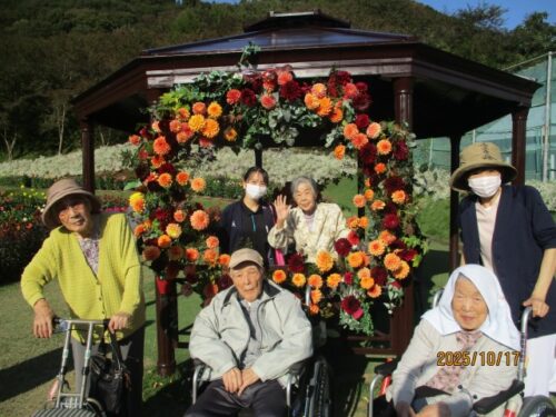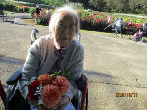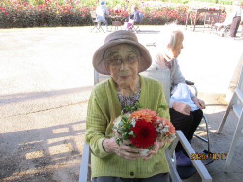 ベンチなどの休憩スペースにもダリアが飾られていて、