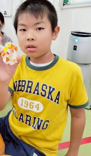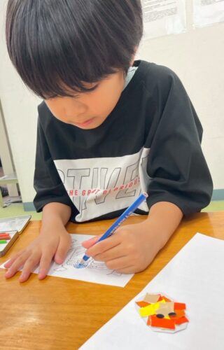 切った紙に、ちいさくちぎった折り紙を貼ってみの虫ができました。