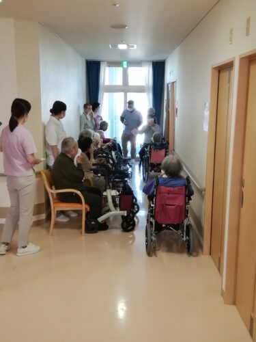 非常ベルが鳴ると職員の誘導のもと入居者様も落ち着いて避難行動をしていただきました。