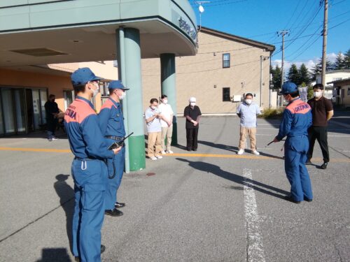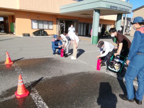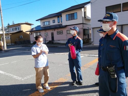 避難後は消火器の使用方法も含め消防署の方々と連携方法の確認を行いました。