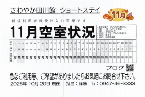 ショートステイの空室状況 10月/11月 [さわやか田川館]
